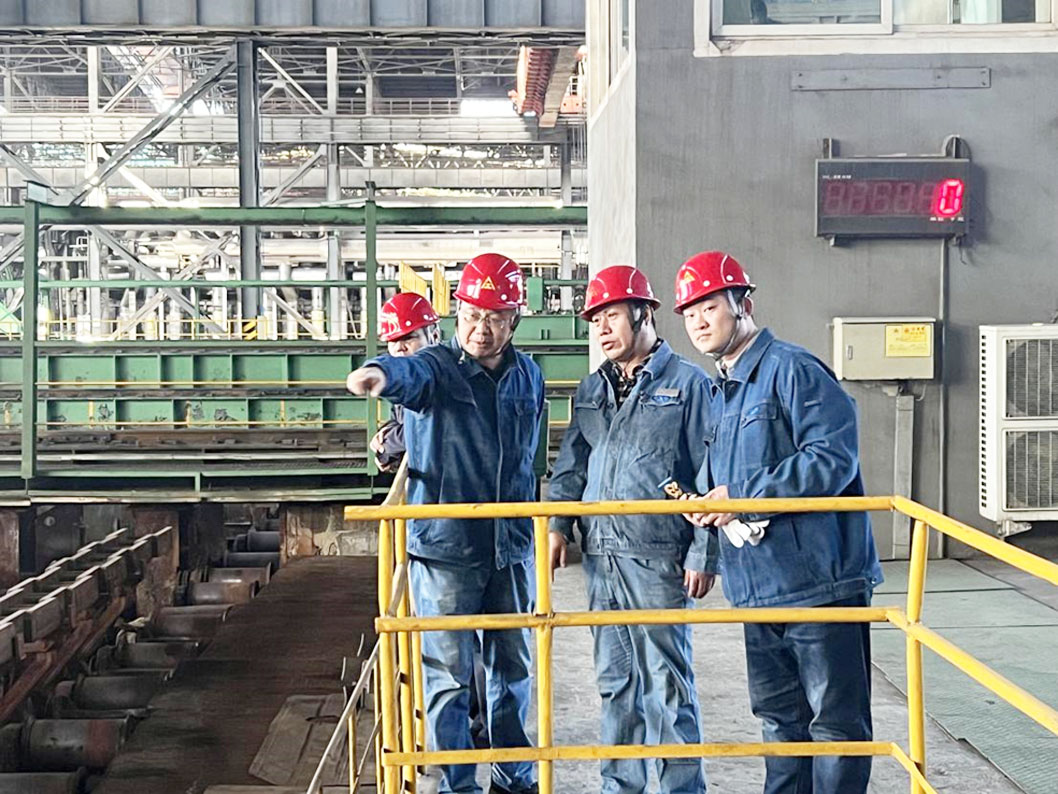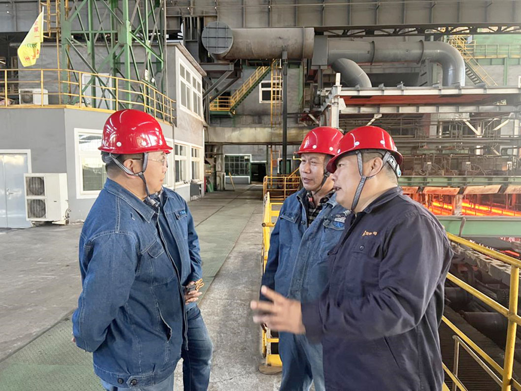 督導組組長楊殿新在煉鋼廠連鑄生產現(xiàn)場與公司生產經理兼安全總監(jiān)陳旭東及煉鋼廠廠長閆海龍進行交流