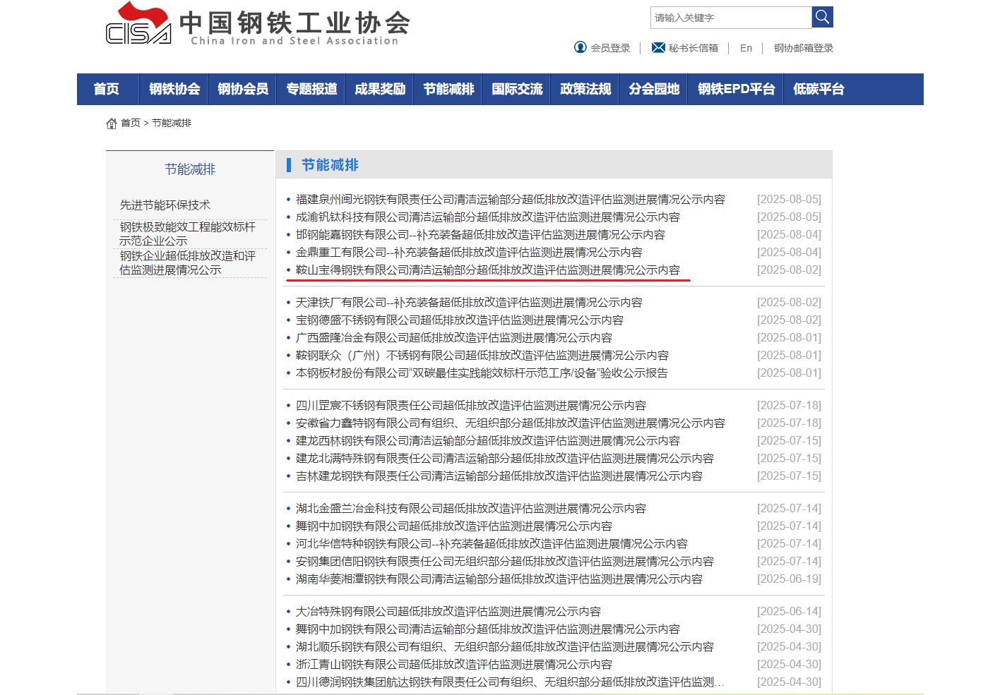 2025年8月2日,中國鋼鐵工業(yè)協(xié)會(huì)對(duì)鞍山寶得鋼鐵有限公司超低排放清潔運(yùn)輸改造和評(píng)估監(jiān)測(cè)情況進(jìn)行了公示,寶得鋼鐵有限公司成為鞍山市除鞍鋼外首個(gè)完成超低排放清潔運(yùn)輸改造和評(píng)估監(jiān)測(cè)工作的企業(yè),標(biāo)志著公司超低排放改造項(xiàng)目取得重要階段性成果。不僅為企業(yè)可持續(xù)發(fā)展奠定了堅(jiān)實(shí)基礎(chǔ),也為鞍山地區(qū)的環(huán)境保護(hù)作出了積極貢獻(xiàn),是企業(yè)履行社會(huì)責(zé)任的生動(dòng)實(shí)踐。